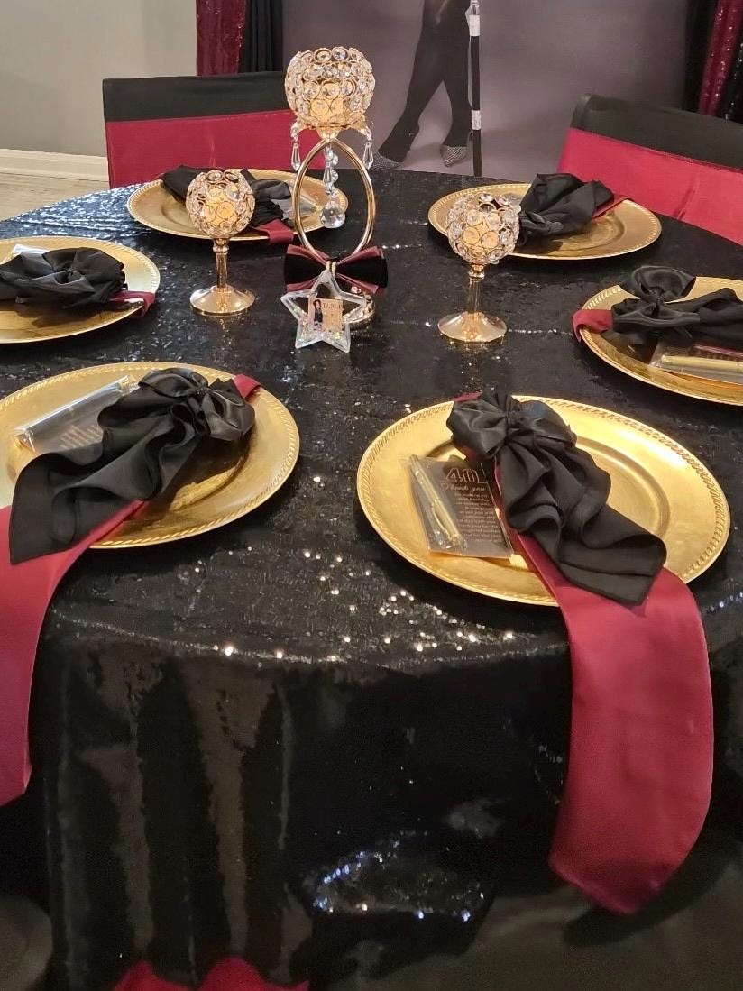 Planning a black tie party - or want to your table to look like one? This simple, elegant napkin ring is a satin ribbon tied into a bow with a glittery ribbon marking the center of the bow. The bow tie is tied on to your napkin with a satin ribbon.